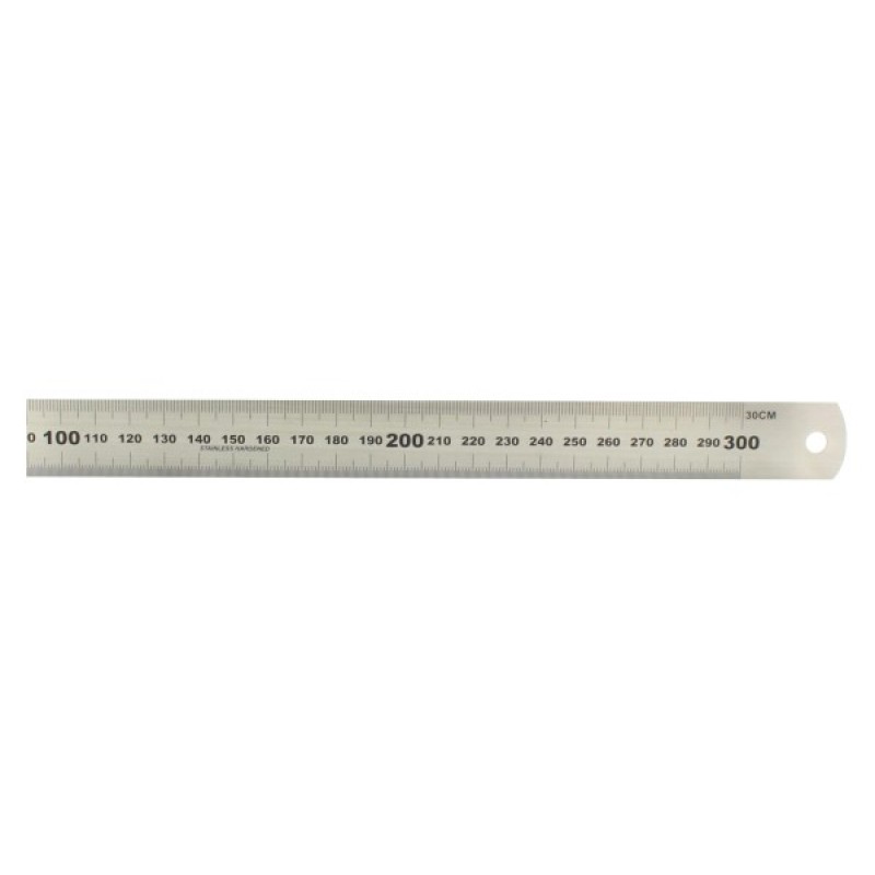 A vonalzó rozsdamentes acélból készült. A fém vonalzó elején és hátulján is jól leolvasható mélynyomott fekete milliméter kiosztás található. Az acél vonalzó felső élén 1.0 milliméter, míg az alsó élén 0.5 mm-es kiosztás található. A nulla pont a vonalzó legvégén található!