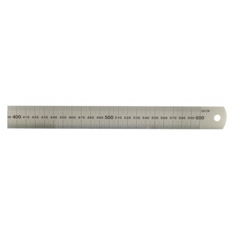 A vonalzó rozsdamentes acélból készült. A fém vonalzó elején és hátulján is jól leolvasható mélynyomott fekete milliméter kiosztás található. Az acél vonalzó felső élén 1.0 milliméter, míg az alsó élén 0.5 mm-es kiosztás található. A nulla pont a vonalzó legvégén található!