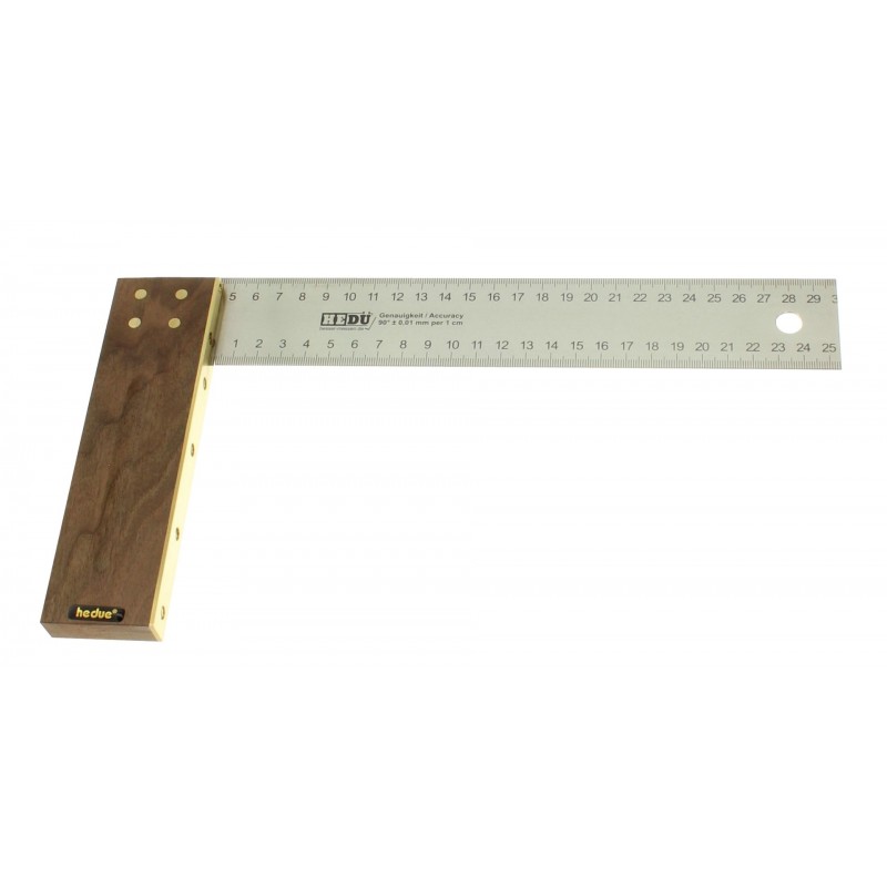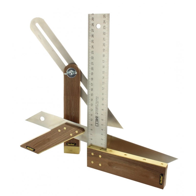 A szettben lévő szerszámok mind magas minőségben készülnek. A fém részek rozsdamentes anyagból a fa részek pedig diófából készül. Az asztalos derékszög kétoldali mélynyomású mm skálát kapott. A derékszög 0,01mm pontos egy centiméteren.