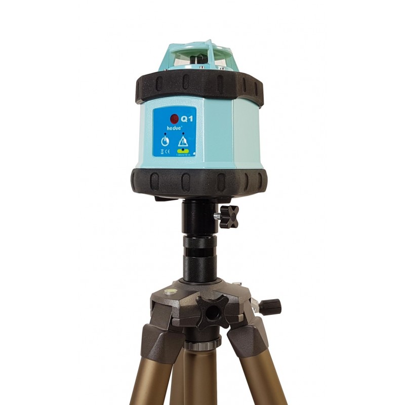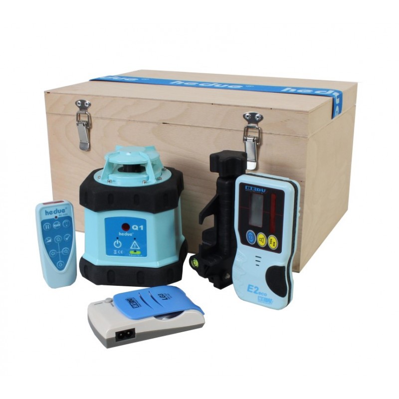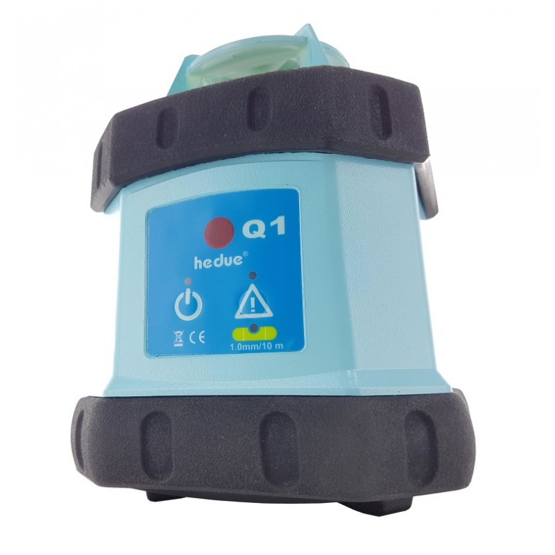 A hedue Q1 forgólézer önbeállási tartománya 5°, a szintezési pontossága pedig 1 mm - 10 méteren. A tartozék hedue E2 jelfogóval a munkatartomány 250 méter, sugárban. A Q1 működéséhez 4 db AA akku szükséges, mely a csomagban megtalálható. A készülék háza IP64 védelem szerinti, így fokozottan ellenáll az víznak és a környezeti szennyeződésnek.