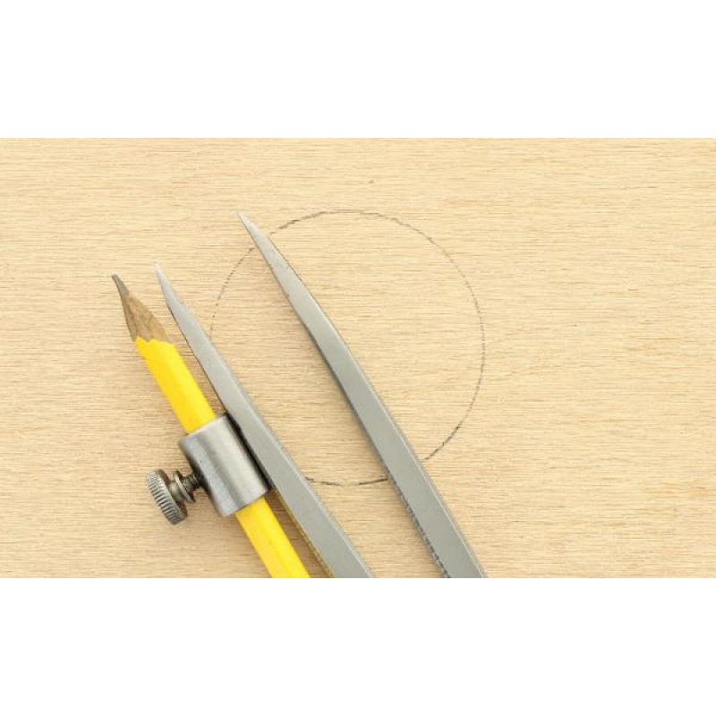 Edzett acélból készült körző, polirozva. A körző szárai nagyméretű csavarral rögzíthető, egyik szárán ceruzatartóval.